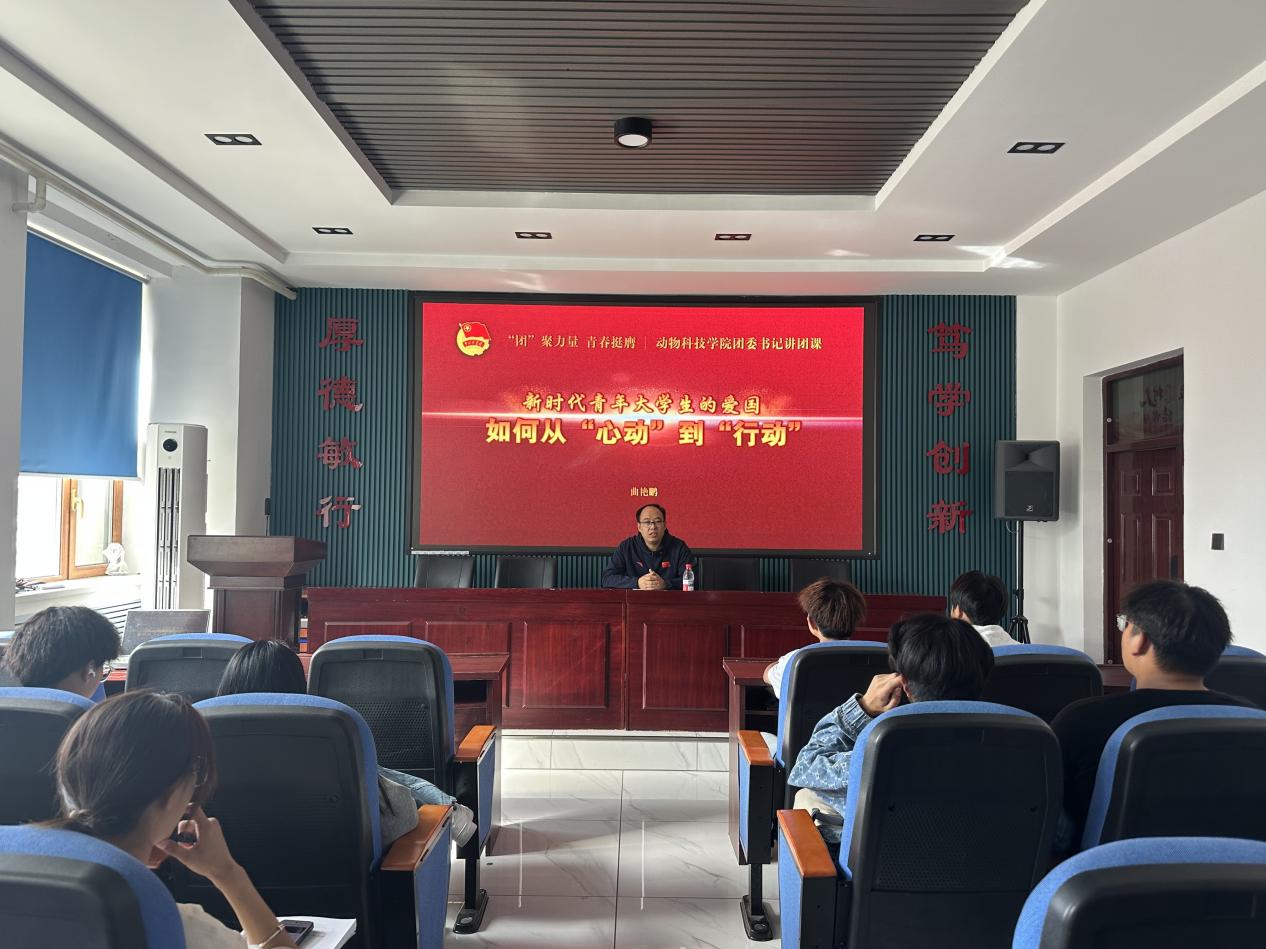 曲艳鹏结合历史与现实,通过讲述革命先辈为国奉献的感人故事、新时代科研工作者扎根领域助力国家发展的案例,引导同学们深刻理解“爱国”的内涵。针对“如何从‘心动’到‘行动’”这一核心问题,曲艳鹏从畜牧兽医专业大学生实际出发,提出四点倡议:一是先懂“专业里的家国”:让“心动”有根有据,二是把“课堂所学”变成“实践所用”:让“行动”落地专业,三是锚定“行业需求”立大志:让“行动”瞄准未来,四是做“懂行”又“实干”的爱国畜牧兽医人。他鼓励同学们都能做“懂行”又“实干”的畜牧兽医人,让青春在为行业发展、为国家建设的奋斗中,绽放光彩!
