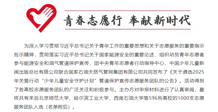学院“童心管护”志愿服务队成功入选2025年关爱行动“少年儿童安全守护计划”管道保护宣传志愿服务团队