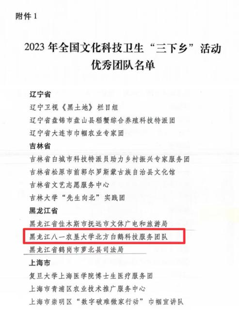 近日,中央宣传部办公厅印发的《关于公布2023、2024年全国文化科技卫生“三下乡”活动优秀团队和服务标兵名单的通知》(中宣办发〔2025〕24号),公布了全国优秀团队和服务标兵名单。beat365官网“北方白鹅科技服务团队成功入选优秀团队,黑龙江省2023年共有3个团队受到表彰,beat365官网是2023年黑龙江省内唯一获此殊荣的高校。