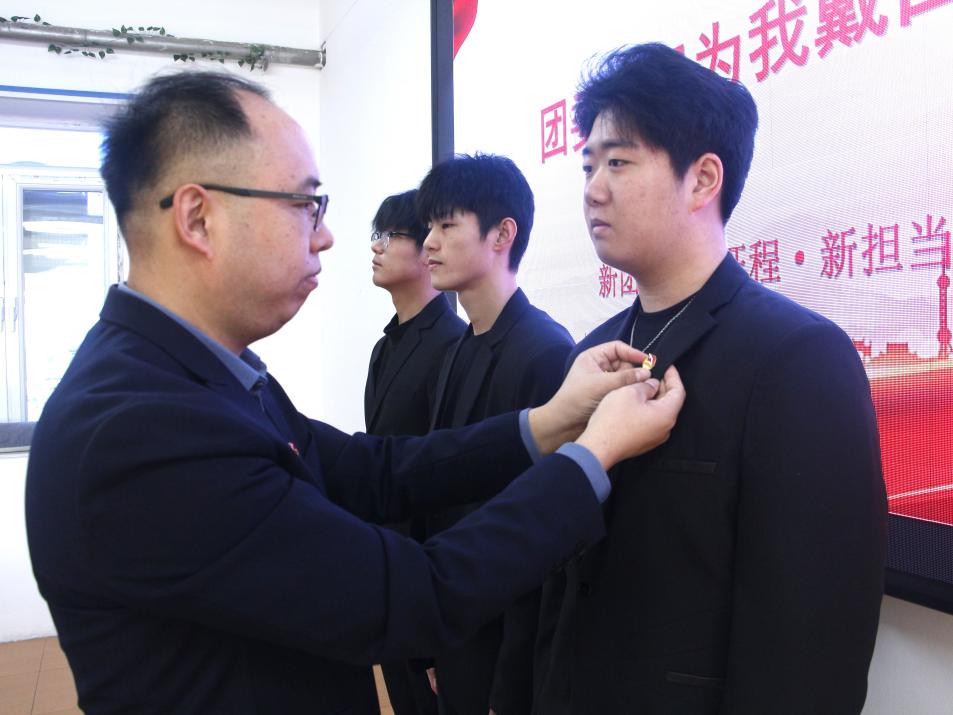 会上,曲艳鹏带领全体新团员共同学习并齐唱中国共产主义青年团团歌《光荣啊,中国共青团》,为新发展的团员逐一佩戴团徽,标志着他们正式加入中国共产主义青年团,成为一名光荣的共青团员。