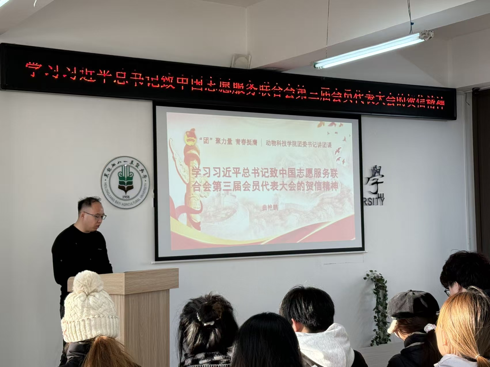 为深入贯彻习近平总书记关于志愿服务的重要论述,传承弘扬“奉献、友爱、互助、进步”的志愿精神,引导青年学子在服务他人、奉献社会中践行青春使命,12月10日,学院在1-2号楼连廊“一站式”学生社区开展“‘团’聚力量 青春挺膺”团委书记讲团课——学习习近平总书记致中国志愿服务联合会第三届会员代表大会贺信精神,学院团委书记曲艳鹏以“深学贺信精神 勇毅躬身实践”为题,为团员青年讲授专题团课。