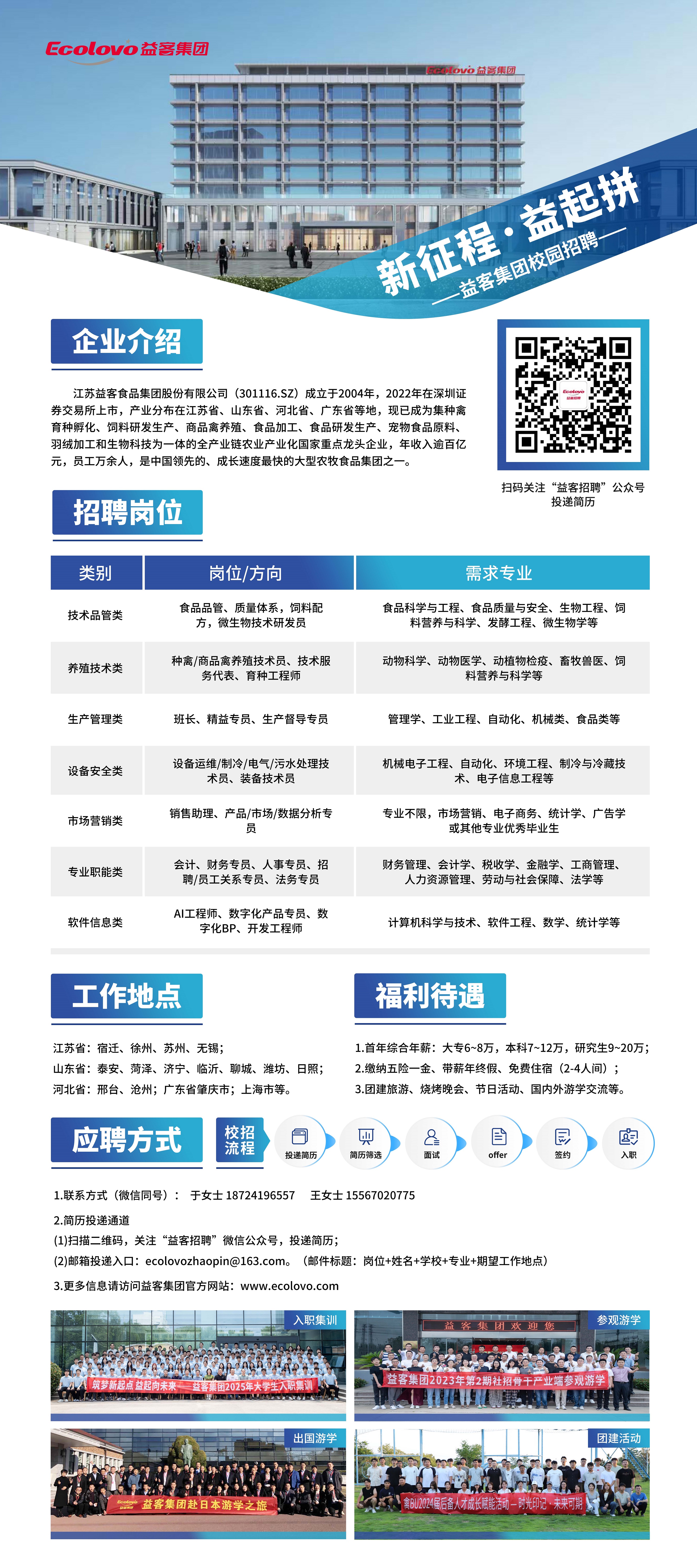 江苏益客食品集团股份有限公司(301116.SZ)成立于2004年,2022年在深圳证券交易所上市,产业分布在江苏省、山东省、河北省、广东省等地,现已成为集种禽育种孵化、饲料研发生产、商品禽养殖、食品加工、食品研发生产、宠物食品原料、羽绒加工和生物科技为一体的全产业链农业产业化国家重点龙头企业,年收入逾百亿元,员工万余人,是中国领先的、成长速度最快的大型农牧食品集团之一。